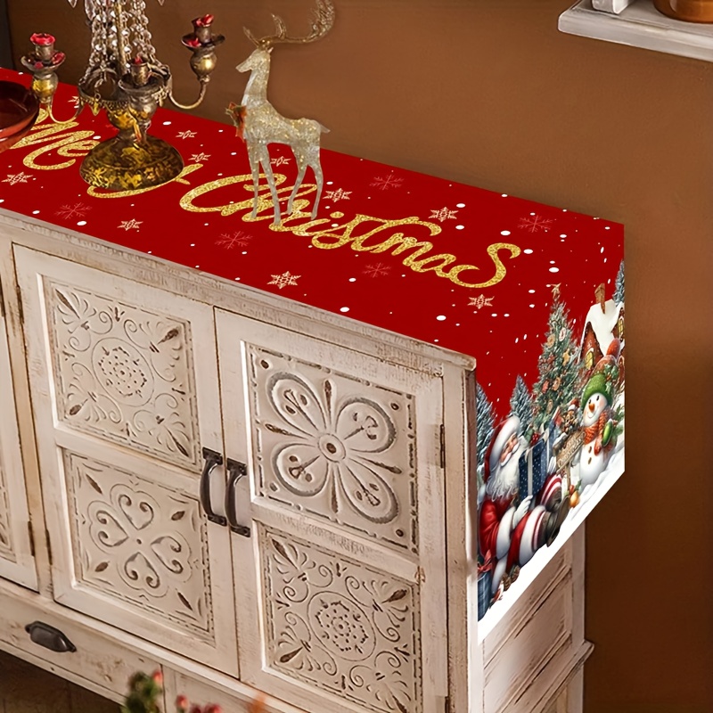 1pc Extra Long Christmas Table Runner - Large 180x35cm (70x14in) Red & Golden Holiday Table Decor with Santa, Snowman, Xmas Tree - Durable Polyester Table Cover for Christmas, New Year's, Parties - Easy-Clean Kitchen, Dining,