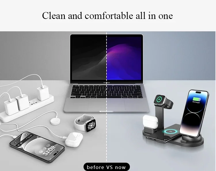 【Easy to use】Just install your iwatch charger cord into the hole, then it can work as charging stand for you as all the other connector are already built-in. No more cable required,make your desk neat and organized.
