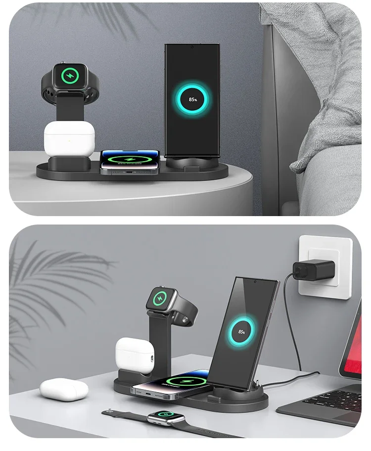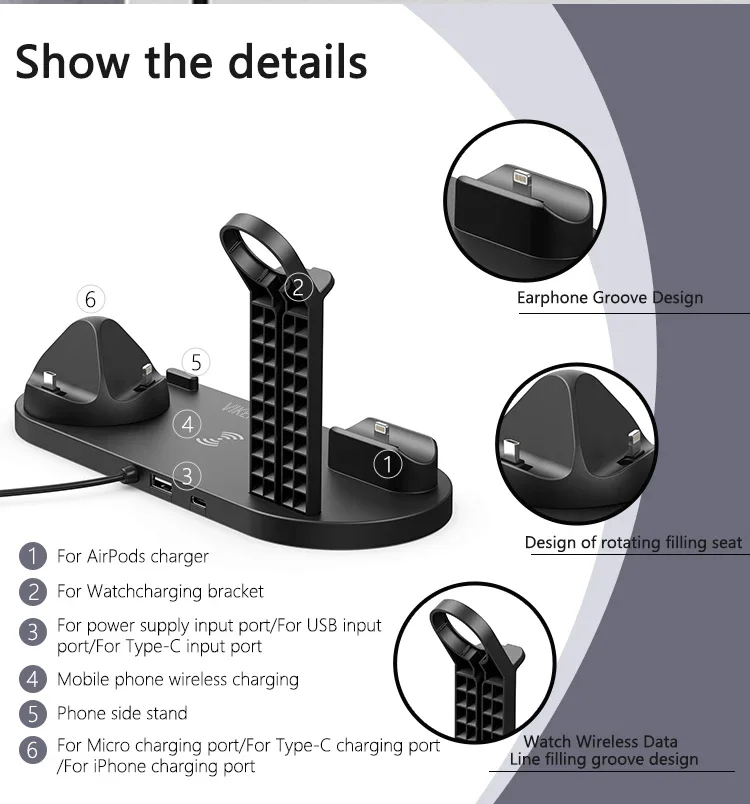 【New Upgrade Version】1.Upgraded to quick charger. 2.Back USB built-in 3.Compatible with All Airpods Pro and apple watch. The Smart charging station combined qi fast wireless charger with 3 connectors base charger, iWatch ,Airpods charger and a USB outlet in one holder, support charging your apple watch, Airpods,iPhone/Samsung simultaneously. The 3 connectors base is rotary at 360°, Suitable for iPhone ,Android Type-c and Android Micro-usb cell phones