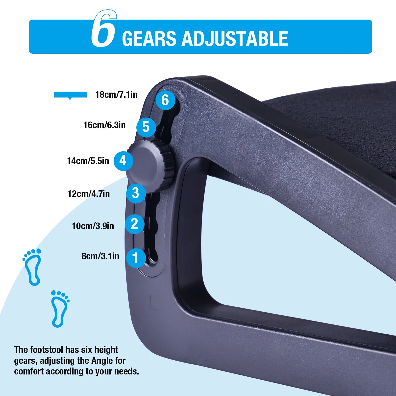3. 6 Height Adjustability: office chair footrest with 6 height gears adjustable 3.5", 4.3", 5", 5.9", 6.7", 7.4" provide 6 different angles, easy adjustment; Ideal for shorter people whose feet often dangle from their chairs. It facilitates active sitting that keeps your legs moving and blood moving. Help you keep comfortable.